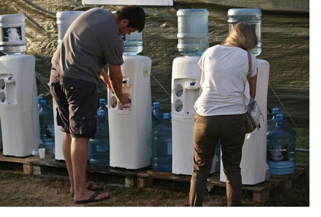 Cette solution permet de limiter le gaspillage tout en proposant l'eau en libre service, mais nécessite une équipe (de bénévoles) pour assurer le remplacement des bonbonnes.